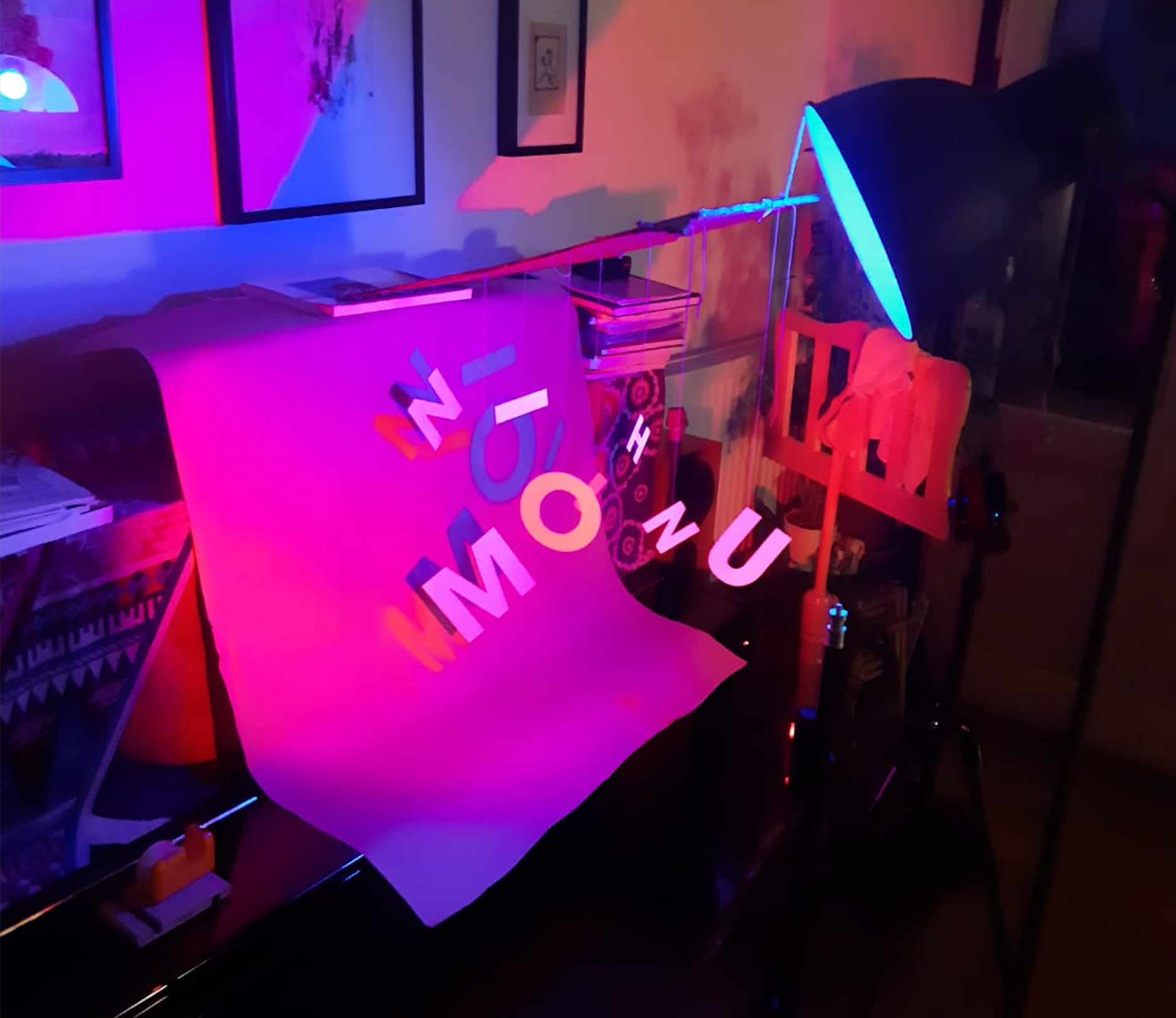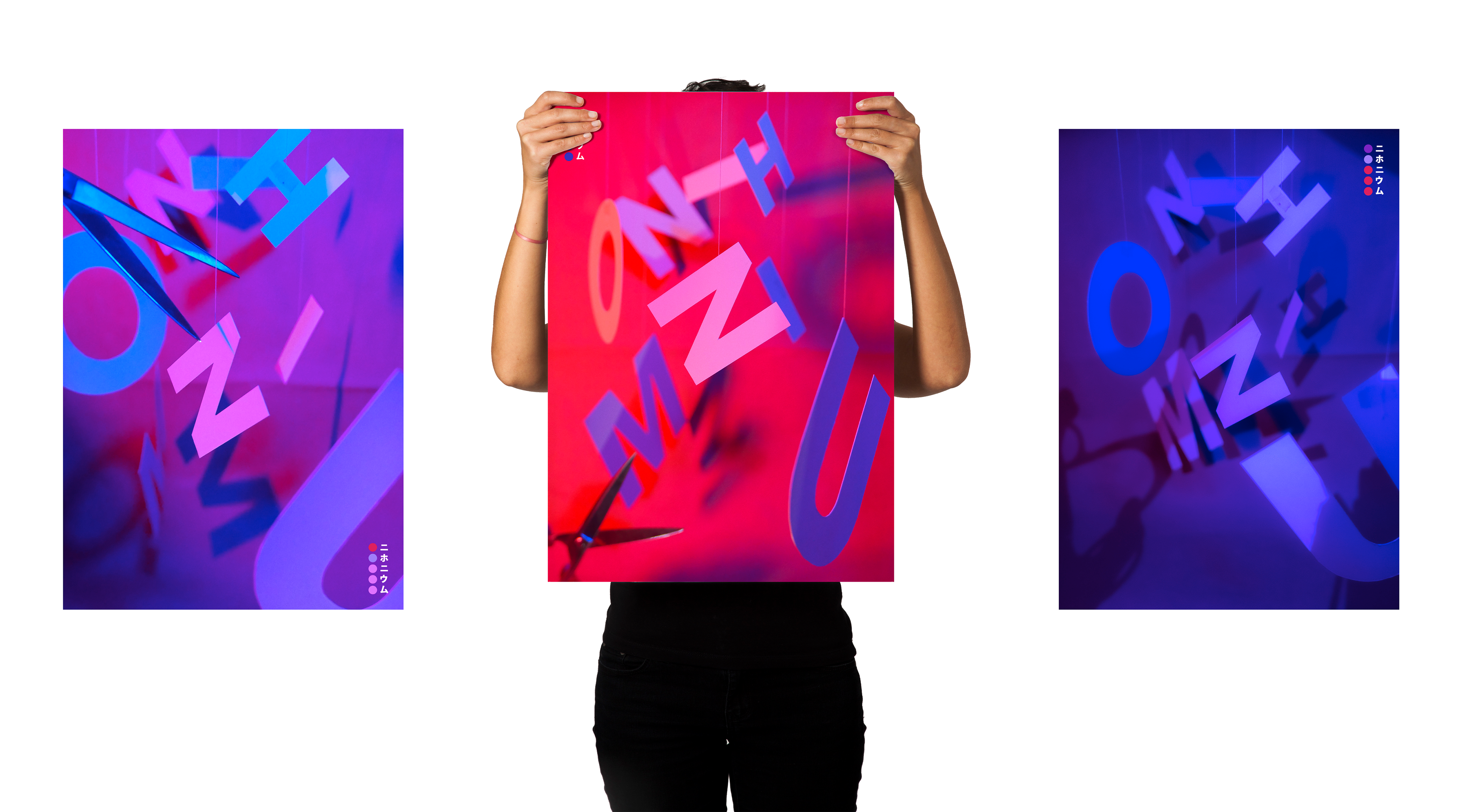 Floating letters, scissor blades, and hazy lighting convey the artificiality, instability, and short lifespan of this radioactive element. The 113 colored dots reference its atomic number.