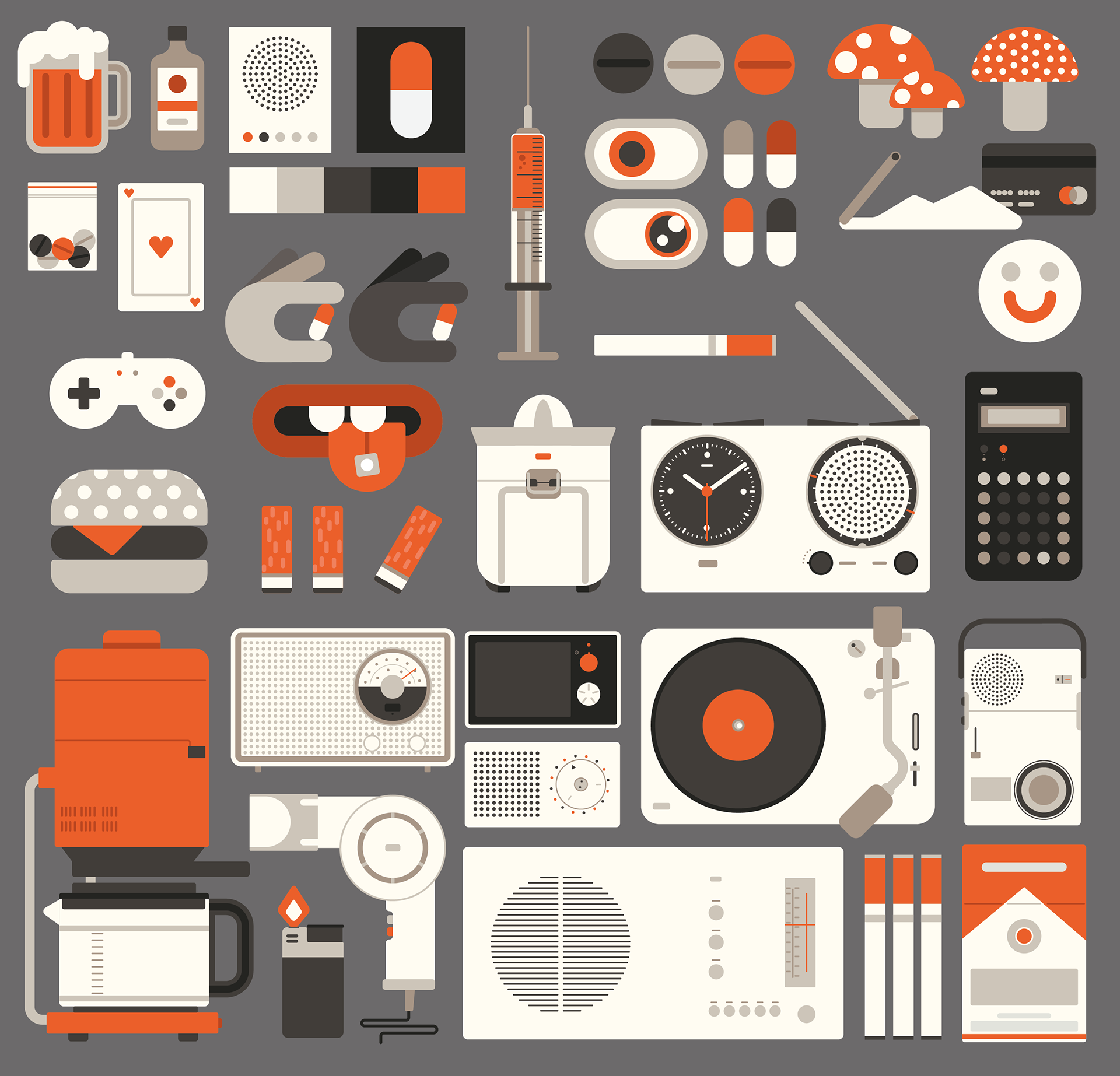 A conceptual design series exploring the idea of design as an addictive substance. Inspired by the iconic work of Dieter Rams, these objects combine his minimalist aesthetic with symbols of addiction — from habits to consumerism.